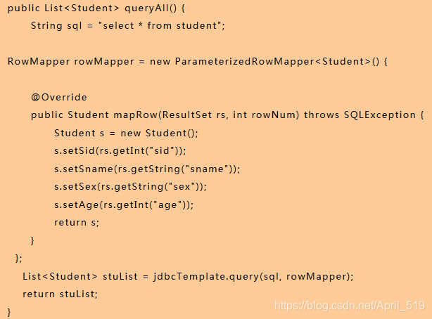 JdbcTemplate的query()方法实现查询,有两个参数:第一个参数是一个字符串,包含要执行的sql语句;第二个参数是RowMapper对象,它从ResultSet里提取数值并构造一个实体对象返回。