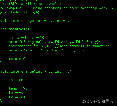 这意味着出现在函数interchange()原型和定义中的形参u和v,是把地址作为它们的值。因此,应把它们声明为指针。