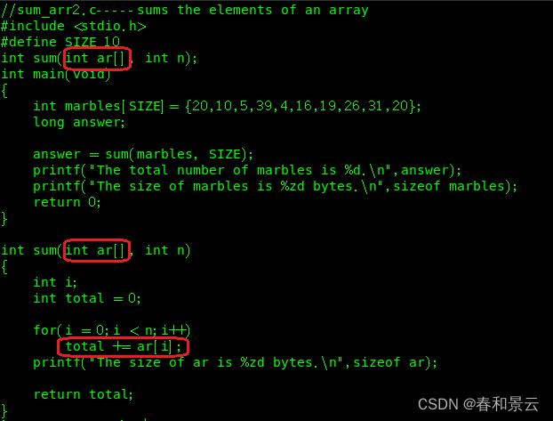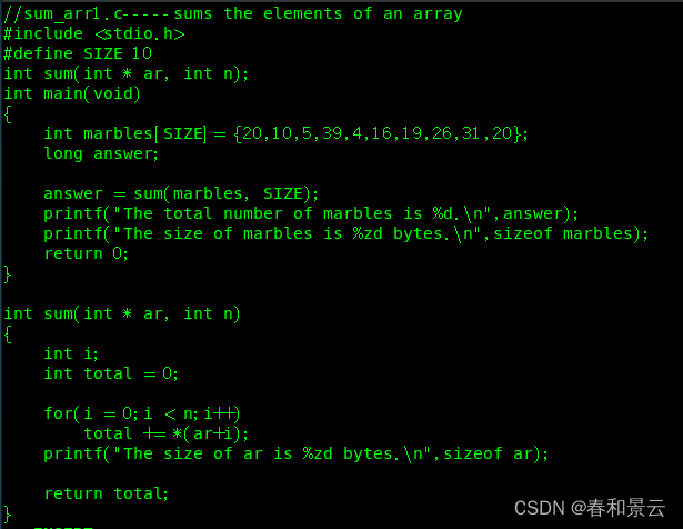 假设我们要编写一个处理数组的函数,该函数返回数组中所有元素之和。假设一个int类型数组的名称为marbles。