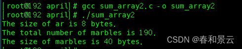 这里marbles的大小是40字节,因为marbles中有10个整型数,每个值占4字节,所以一共占40字节。但ar的大小才8字节,是因为ar并不是数组本身,它是一个指向marbles数组首元素的指针,我们的系统中用8字节储存地址,所以指针变量的大小是8字节(不同系统可能会有差异)。