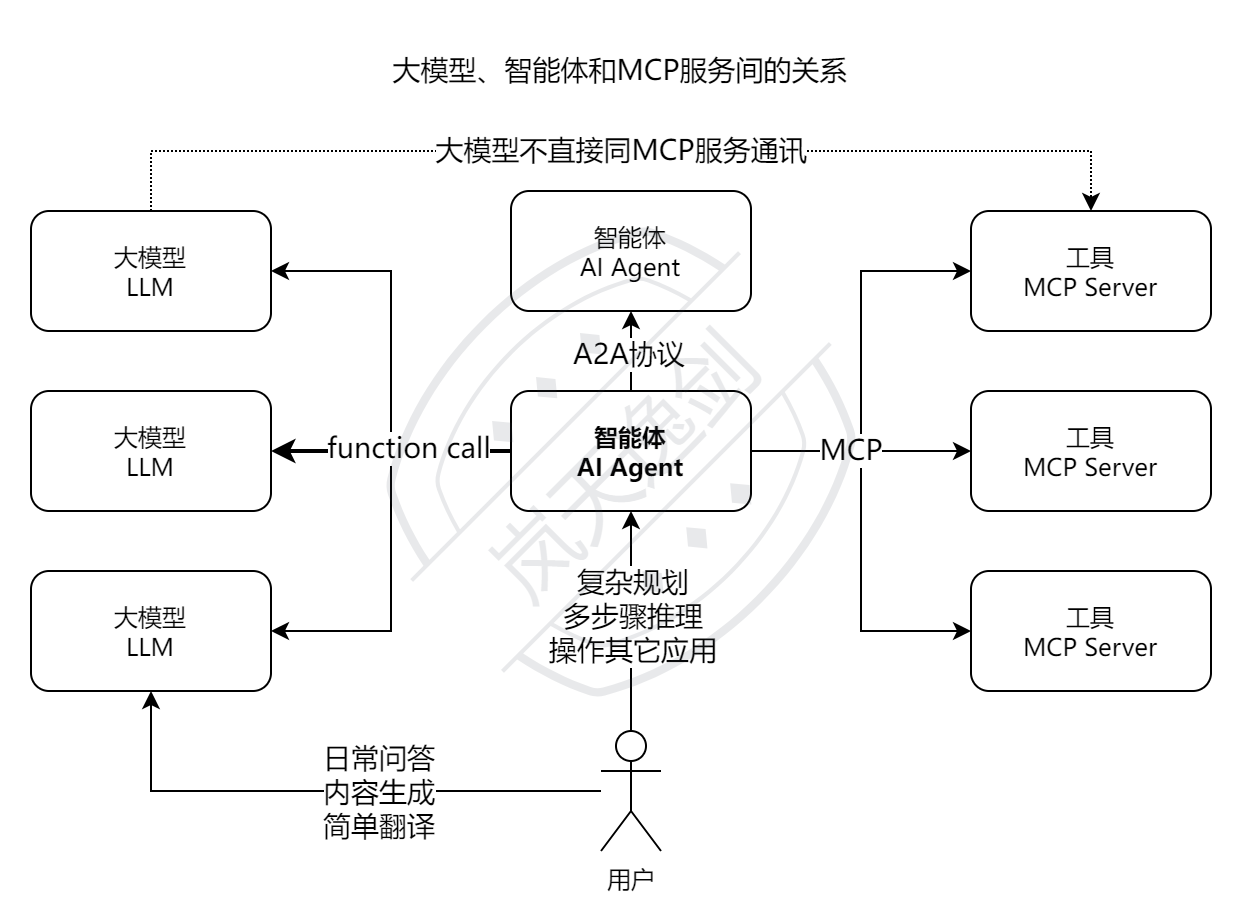 大模型不直接与MCP服务通讯,它们之间必然存在Agent或其它形式的中间层。