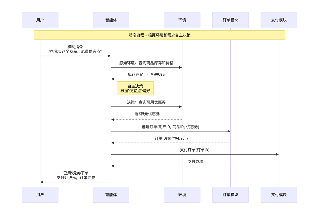 智能体(ShoppingAgent):步骤动态生成(如根据用户偏好增加 “查询优惠券” 步骤),能感知环境并自主决策,像 “有自主意识的执行者”。