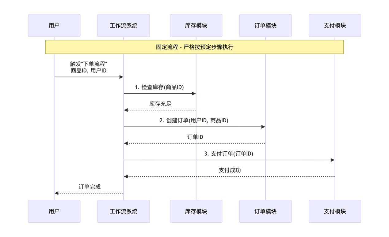 // 输出:严格按"检查库存→创建订单→支付"步骤执行,步骤固定不变
