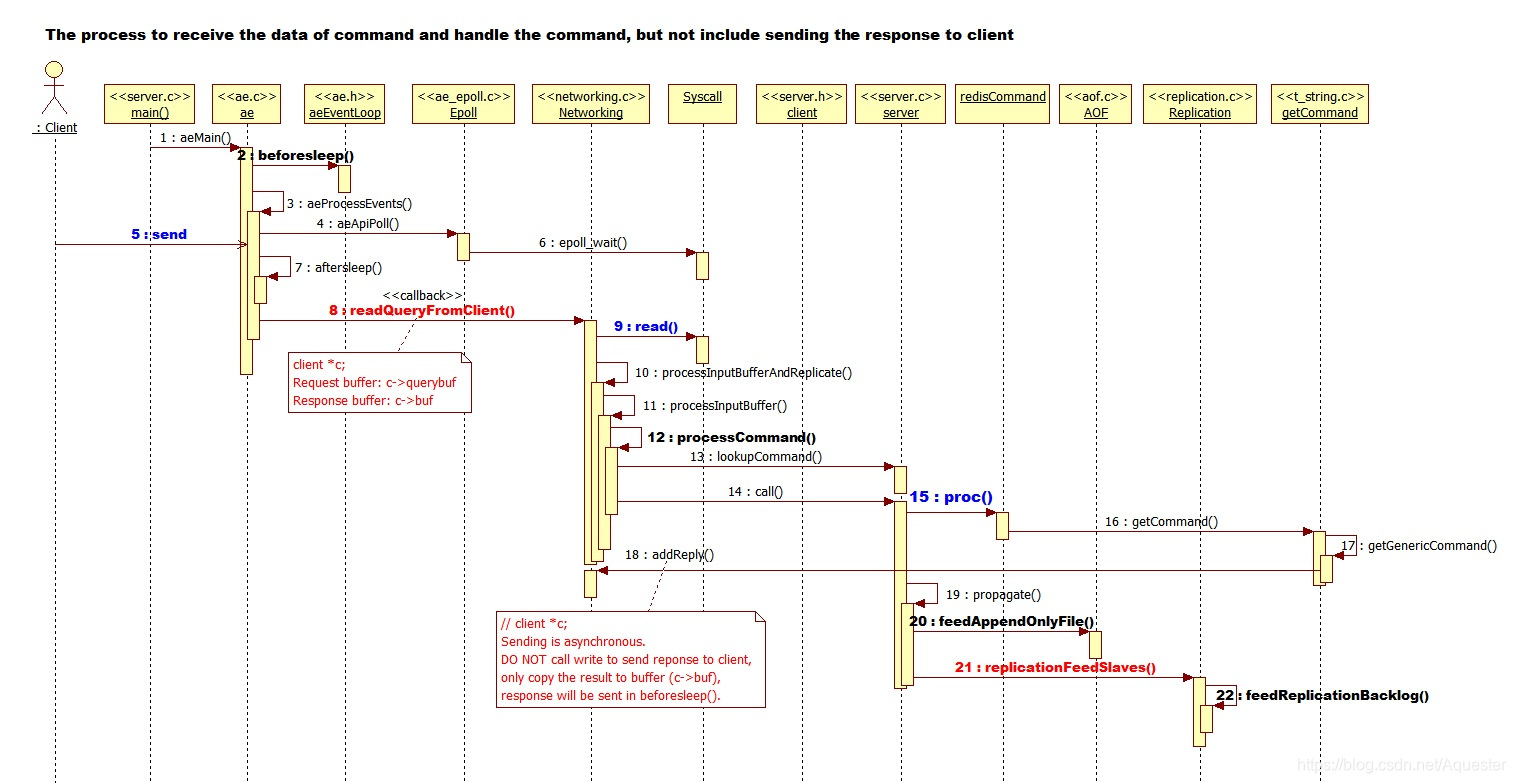 void readQueryFromClient() // networking.c:1494 { // 这里调用read收数据 // client传过来的数据大小不能超过配置项client-query-buffer-limit指定的值。 // 默认大小为1G,足够覆盖大部场景。 // 如果超过大小,则可看到WARNING日志: // Closing client that reached max query buffer length // 实际中,一般远小于1G,所以可能将这个值调小一点,以增加对REdis的保护。 int nread = read(fd, c->querybuf, readlen); int processCommand(client*) // networking.c:2543 { redisCommand* lookupCommand(name) { // REdis所有命令存储 // 在struct redisServer的command表中: // struct redisServer { // dict *commands; // Command table // }; // 可将redisCommand看作一个C++抽象基本, // 该抽象基本定义了纯虚函数proc: // typedef void redisCommandProc(client *c); // struct redisCommand { // redisCommandProc *proc; // }; // 而command表中的每一个成员则为redisCommand的实现。 return dictFetchValue(commands,name); }