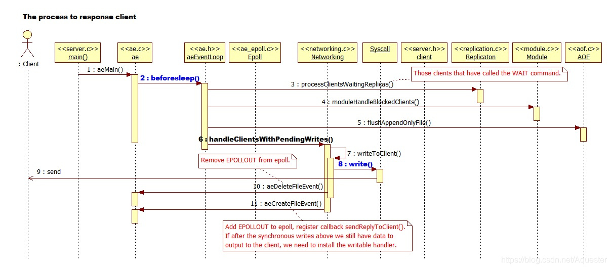 // 响应和接收处理是分开的两个过程。 int main() { // “ae”为“A simple event-driven”的缩写 void aeMain() { while (!eventLoop->stop) { // 调用eventLoop->beforesleep(eventLoop); // 但实际调用的是server.c中的beforeSleep: void beforeSleep(struct aeEventLoop*) { int handleClientsWithPendingWrites() { // REdis接收和处理 // 命令流程会设置clients_pending_write, // clients_pending_write实为一个队列链接。 // 当处理完一个命令后,调用clientInstallWriteHandler // 将当前client添加到clients_pending_write中。 // 但是有些命令并不需要响应,因此没有这个动作。 listRewind(server.clients_pending_write,&li);