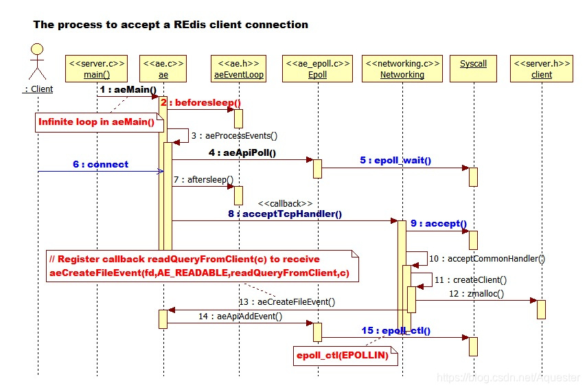acceptCommonHandler(cfd) { // createClient会将c添加server.clients中, // server.clients是一个链接。 client *c = createClient(cfd) { aeCreateFileEvent( server.el,fd,AE_READABLE, readQueryFromClient, c) { // mask值为AE_READABLE(对应于epoll的EPOLLIN), // 对于epoll实际调用的是epoll_ctl。 aeApiAddEvent(eventLoop,fd,mask); } } } } } } } } |