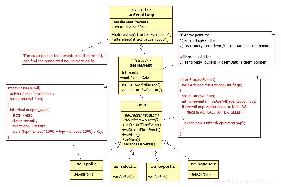 可以把ae.h/ae.c看成是抽象基类,而ae_epoll.c、ae_select.c、ae_evport.c、ae_kqueue.c看成是ea的具体实现,以面向对象来看,大致如下图所示:
