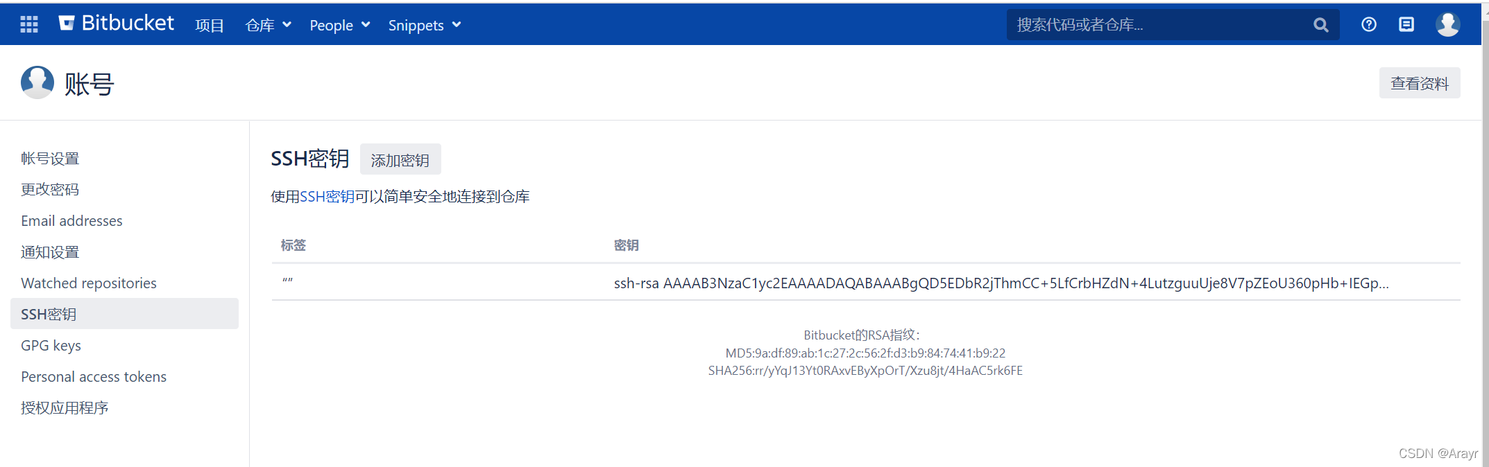 bitbucket打开这个页面【个人信息】-【SSh密钥】-【添加密钥】