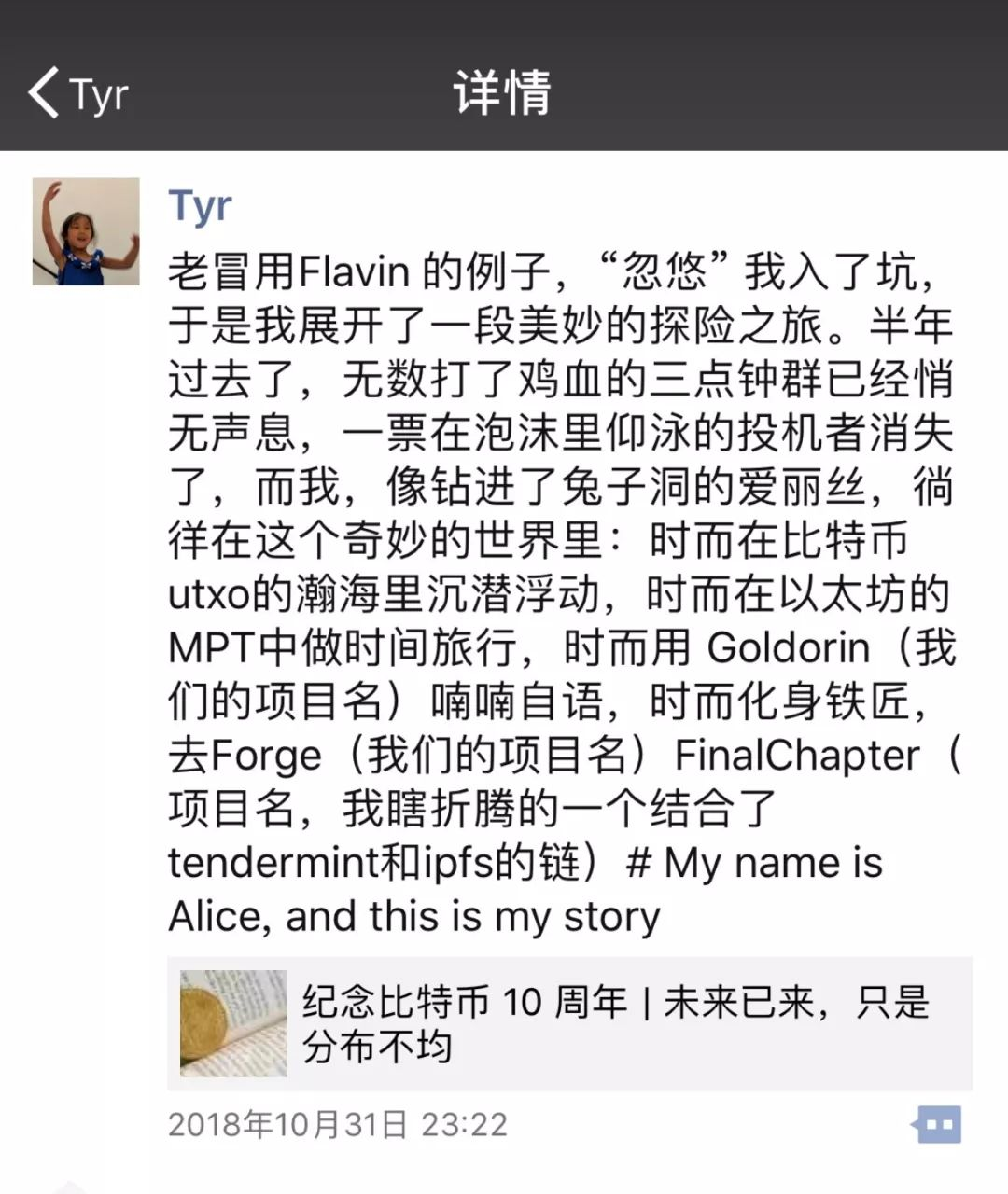 10月31日,陈天发朋友圈感慨自己投身区块链创业“半年过去了,无数打了鸡血的三点钟群已经悄无声息,一票在泡沫里仰泳的投机者消失了,而我,像钻进了兔子洞的爱丽丝,徜徉在这个奇妙的世界里……”