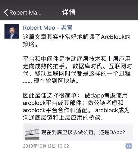 10 月 12 日,ArcBlock 区块基石创始人兼 CEO 冒志鸿在转发一篇媒体文章表示,“平台和中间件是推动底层技术和上层应用走向成熟的推手。数据库时代、互联网时代、移动互联网时代都是这样的一个过程……现在轮到区块链。”