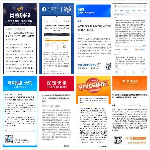 当日,共享财经、星球日报、链闻、耳朵财经、深链财经、CoinVoice、陀螺财经、支点社区、奇点财经、格隆汇等数十家媒体以快讯形式第一时间报道 ArcBlock 加入亚马逊网络服务合作伙伴计划,成为全球技术合作伙伴。