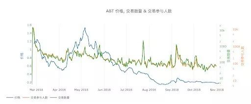 这是一个叠加了ABT价格、交易数量和交易参与人数的折线图。其中蓝线表示的是ABT的价格变化,绿线是ABT的日交易数量,即在一天中以太坊上记录了多少关于ABT的交易。从数据分析结果可以看出,ABT的交易数量和交易人数一直维持在一个比较稳定的区间。