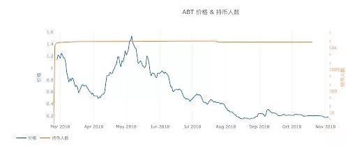 我们通过聚合计算,分析出ABT持币人数的趋势图,并和价格图叠加在一起。橙色的线表示持币人数,即有多少账户余额中有多于 0 个ABT。虽然 ABT 价格随市场经历波动,但整体持币人数迄今保持稳定。