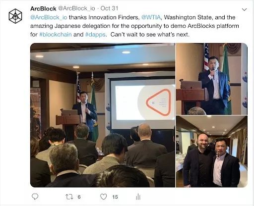 10 月 31 日,ArcBlock 应邀与其他 9 家美国华盛顿州高科技企业一起出席日本总领馆与华州商务部共同主办的 Japan Seattle AI Innovation Meetup (日本西雅图人工智能创新聚会)活动,创始人冒志鸿作为唯一一家区块链企业代表向日立、富士通、三菱、NTT DoCoMo 等 20 大日本企业机构代表介绍 ArcBlock 平台及技术,并与他们亲密交流商务投资等各种合作可能。