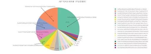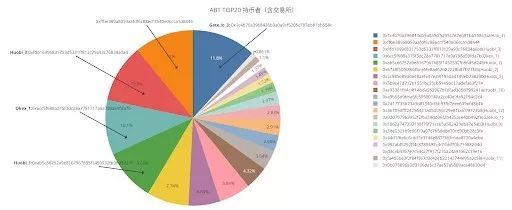 这两幅图表是对目前在二级市场流通的 ABT 主要持币者做的饼状图分析(剔除了32%生态建设、15%团队奖励这两大持币地址)。第一幅图包含了交易所,第二幅图没有包括交易所。可以看出目前 ABT 最大的个人股东是地址为 0xffbe389a8059aafdf6c88ed1f540e06cca1d8444 的账号,其持有的 ABT 在所有个人持有者中占了29.8% 。