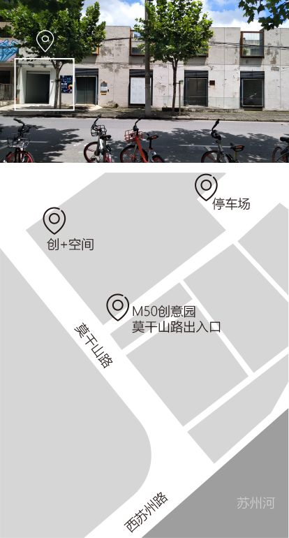 停车:上海创意产业集聚区停车场 (M50园区内)莫干山路及西苏州河路沿街流动停车