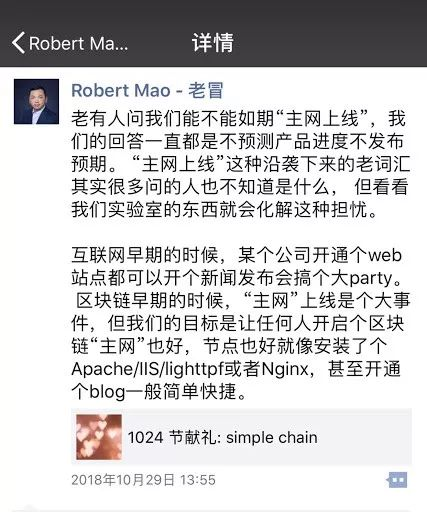 对于社区关注的主网上线,老冒 10 月 29 日通过转发 ArcBlock 研发副总裁陈天一篇博客表达了观点:对ArcBlock而言,目标不只为了仅仅上线“主网”,而是要让任何应用的“主网”上线变得简单快捷。今天区块链社区流行很多误解或过时的观点,比如“主网上线”就是这样的一个非常具有误导性的术语。