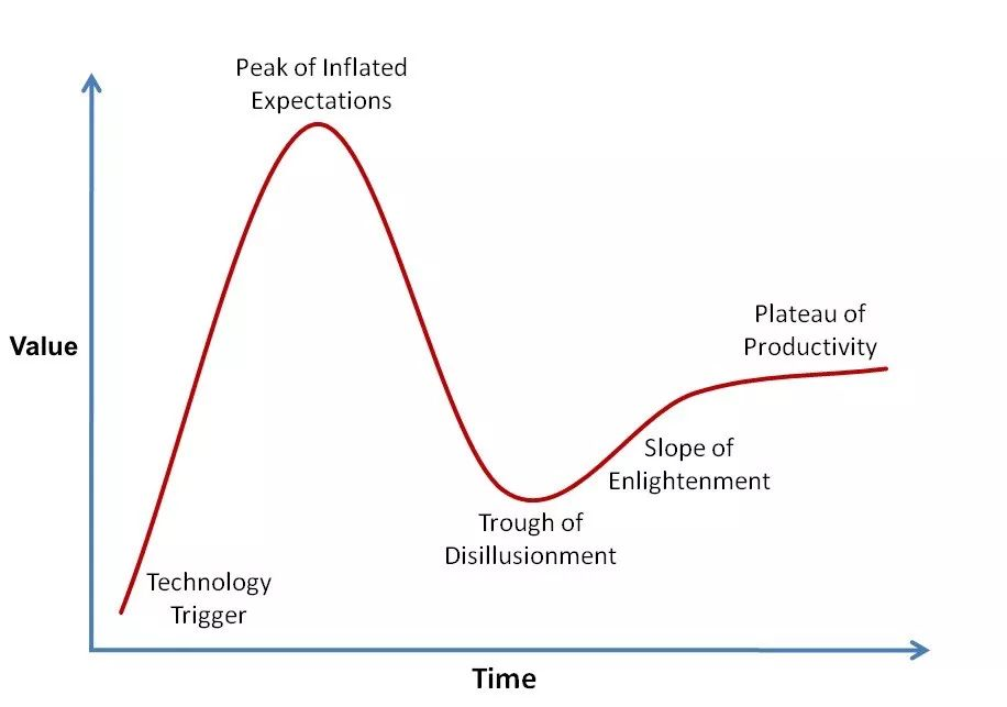 冒志鸿:可以去参考Gartner公司提出的技术成熟度曲线(The Hype Cycle)。每一波技术浪潮其实都是这个样子的,都是从萌芽到泡沫,到泡沫崩溃,然后从低谷慢慢地起来,最后再成长起来。