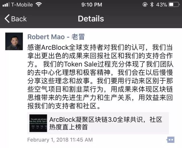 “我们的Token Sale过程充分体现了ArcBlock的去中心化理想和极客精神,我们会在以后慢慢分享这些理念和故事。我们要用行动来区别于那些空气项目和割‘韭菜’行为,用成果来体现区块链思维带来的先进生产力和生产关系,用效益来回报我们的支持者和社区。”