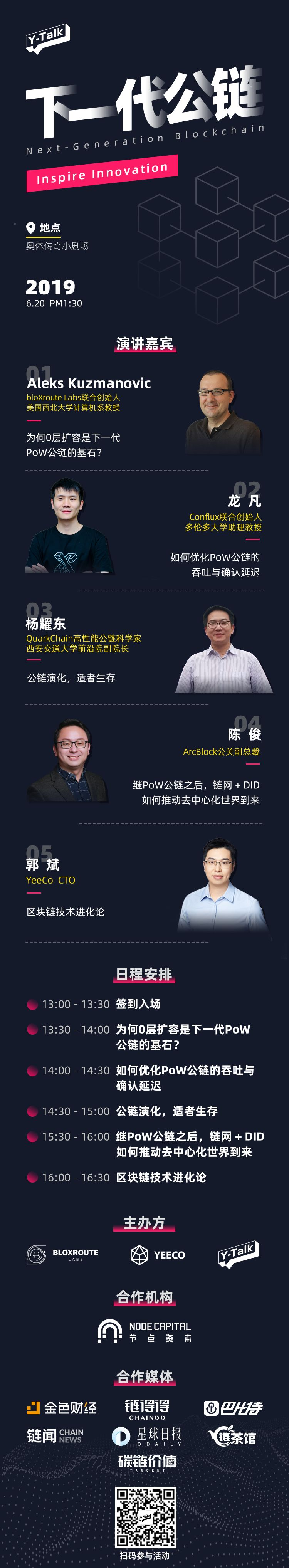 在《Y-Talk:遇见下一代公链》活动中,来自ArcBlock、bloXroute、Conflux、QuarkChain和YeeCo的专家探讨了下一代公链的创新技术,包括0层扩容、POW公链优化、公链演化和去中心化身份验证,为观众呈现了一场区块链技术的盛宴。