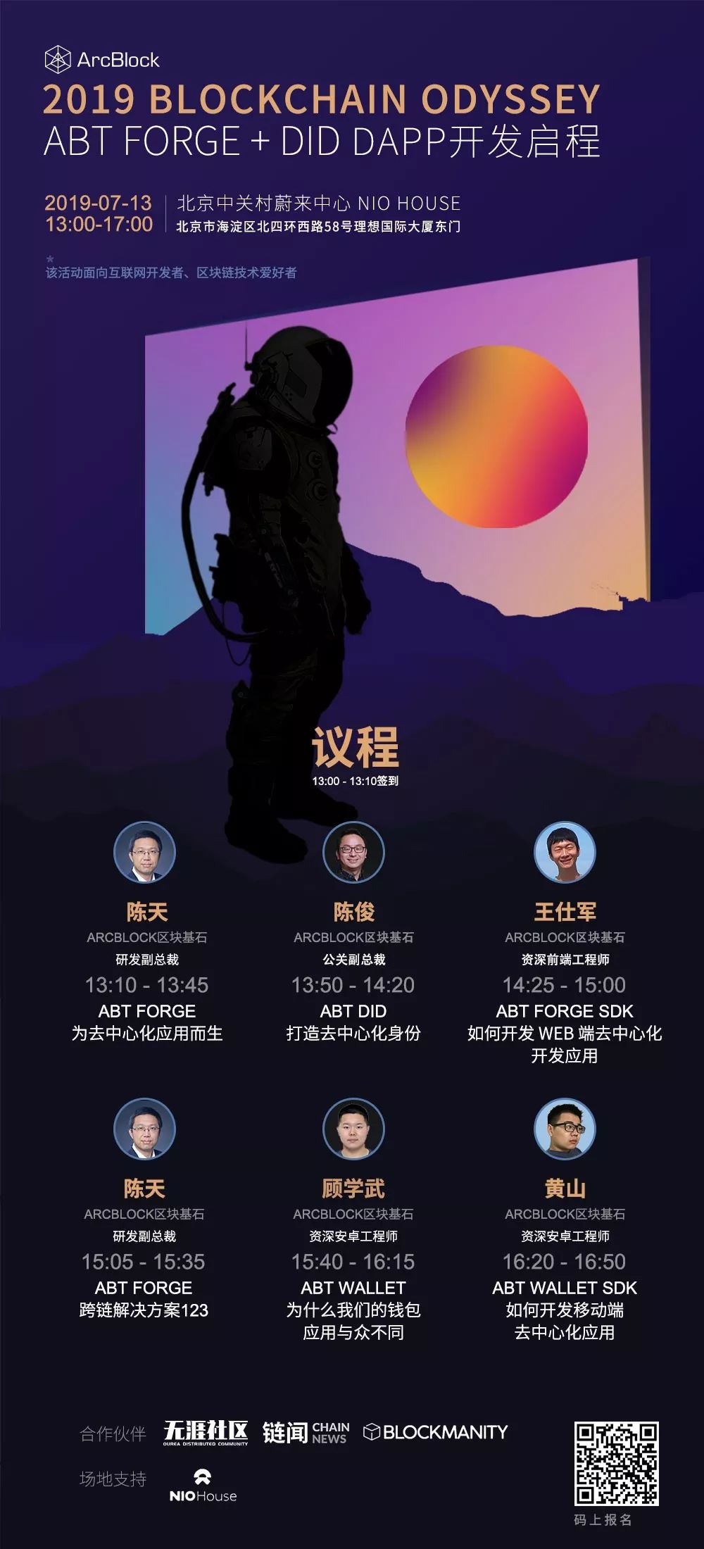 如今,Forge[1] 的开发已经半年有余,ArcBlock 围绕着 Blockchain 3.0 打造的应用开发平台,也渐渐羽翼丰满(详见:ABT 平台开发一周年 去中心化世界之旅才启程)。在这个过程中,团队一直在不断构建,不断接受反馈,不断学习,同时不断将我们所学所感分享在我们的 ArcBlock Technical Learning Series 中。虽然有关 Forge framework 的大部分内容都在官网的学习培训[2]频道里可以找到,但举办一场一站式的、涵盖内容多样的,类似于「区块链技术漫游指南」这样的讲座,一直是关心区块链技术本身的社区用户朋友们的心声。因而,在无涯社区、链闻、Blockmanity、蔚来汽车等各路朋友们的帮助下,我们有了这场名为「2019 Blockchain Odyssey 北京站:ABT Forge + DID,Dapp 开发启程」、干货满满的区块链技术讲座。