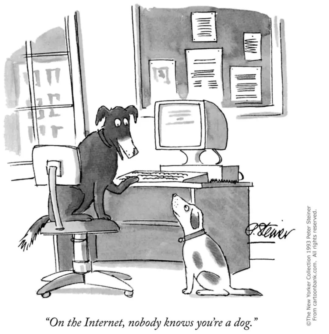 在万维网 30 年前诞生之初,并没有在其底层协议进行数字身份的设计,所以有了这幅著名漫画「在互联网上,没人知道你是一条狗」,它非常生动的描画出,二十多年前互联网刚刚走入寻常百姓家,人们尽享在网上匿名冲浪的快乐。
