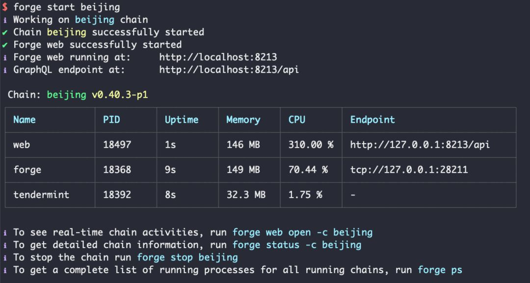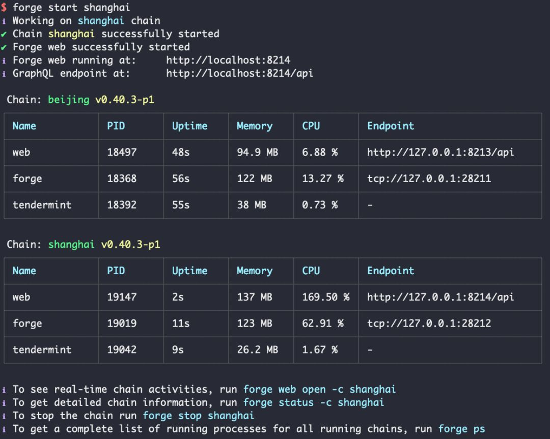 在本地开发时,可能需要多条链的支持,使用最新版的 CLI 可以方便的在本地创建并启动多条链: