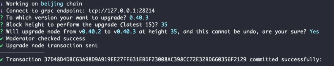 CLI 添加了对链的软升级功能,如果本地已经下载好了需要升级的 Forge 版本,执行 forge upgrade 命令,然后选择相应的 Forge 版本以及块高,CLI 就会自动完成整个升级过程: