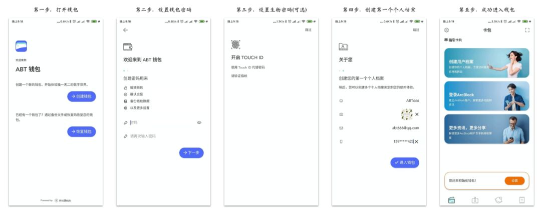整个新建的流程,力求越简单越好。我们放弃了之前将新建钱包和初始化流程结合在一起的方案,在用户第一次安装打开钱包之后,如果选择了创建新钱包,仅需下面几步,用户便可完成钱包的新建工作,并且可以有选择的新建第一份个人身份资料: