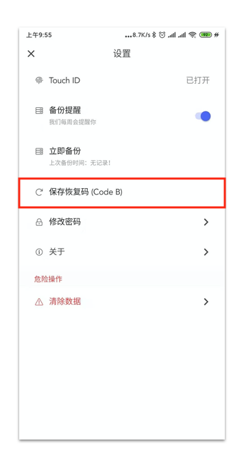 如果是使用 V2.1.* 的版本新创建的钱包,将支持中途利用钱包密码校验导出 CodeB(恢复码)的功能