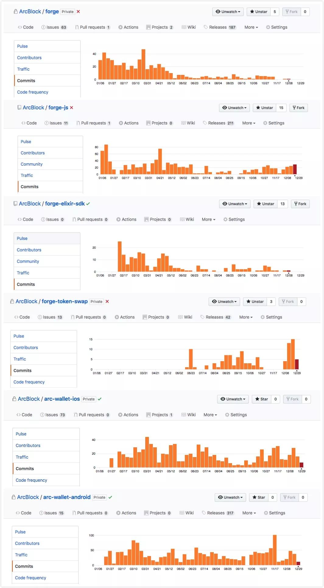 图:ArcBlock 若干 GitHub 核心仓库代码在 2019 年全年更新频率