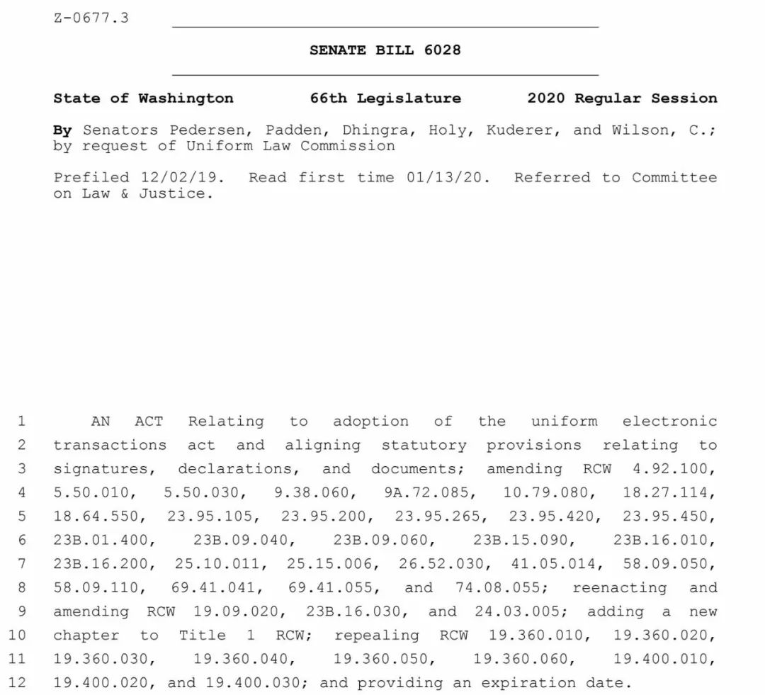 •第二项法案 SB6028[2] 将采用统一电子法案,并调整与签名、证书和文件有关的法定条款。