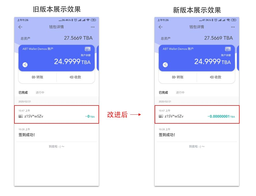 2.3 版钱包优化了金额展示逻辑,对小于 1 的金额增加展示精度,避免出现在列表展示为 0 的情况发生。