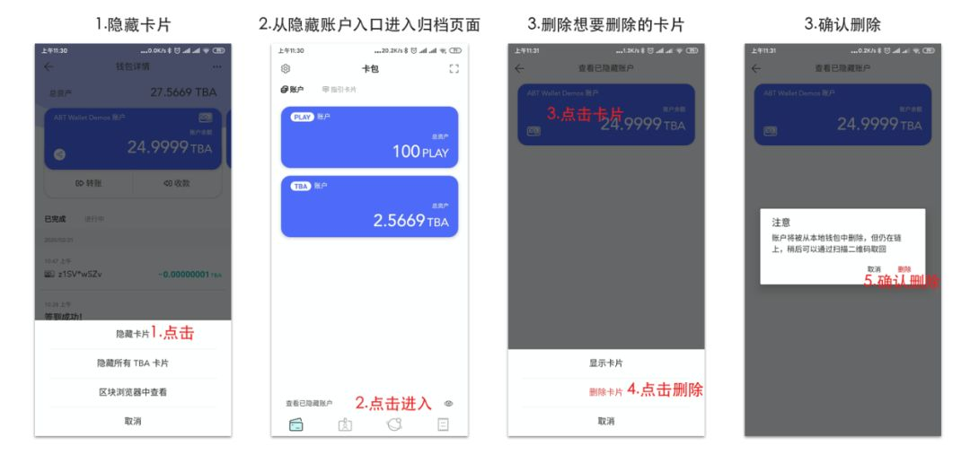 1.这里的删除只是钱包删除,对应的链上账户信息仍在链上可查2.删除之后,与当初产生此账户的 Dapp 再次交互,将会在钱包再次找回此删除的账户3.目前能够删除的账户类型只支持普通类型的账户,其他类型账户不支持手动删除