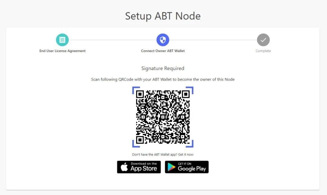 你可以在此处[4]找到钱包的下载链接,并在此处[5]了解更多信息。10.现在,在你的节点运行的情况下,打开 http://YOUR_PUBLIC_HOSTNAME:8089 开始设置你的节点。11.接受最终用户许可协议并用你的 ABT 钱包扫描二维码,开始设置过程。完成后,你将进入“ ABT 节点”仪表板。