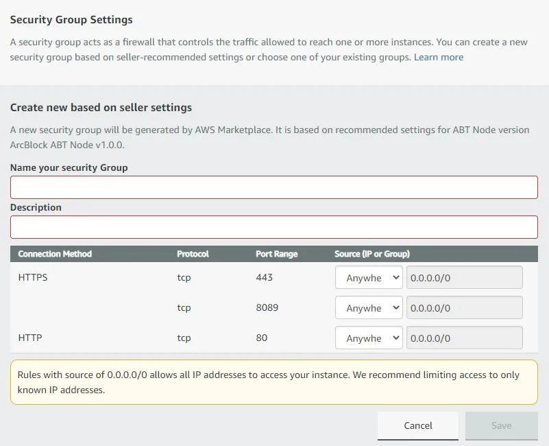 6.输入安全组的名称和描述。在此处,你的新设置应包括以下内容: