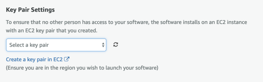 7.接下来,从“密钥对设置”下拉菜单中选择一个密钥对,或创建一个新的密钥对。如果需要,你可以使用密钥对来帮助登录之后的实例。更多信息,请参阅:https://docs.aws.amazon.com/AWSEC2/latest/UserGuide/ec2-key-pairs.html