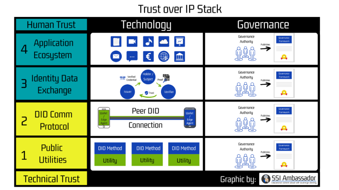 这一堆栈由四层组成。其中两层保证技术信任。诸如 DID 注册表和 DIDcomm 协议之类的公用程序可处理代理之间的点对点通信。第三和第四层提供了人类信任的框架。它们包含信任三角形以及对生态的访问。使用 DPKI(去中心化公钥基础结构),所有参与者的初始“信任根”是支持新形式的根身份记录(又名 DID)的任何分布式账本或去中心化协议。