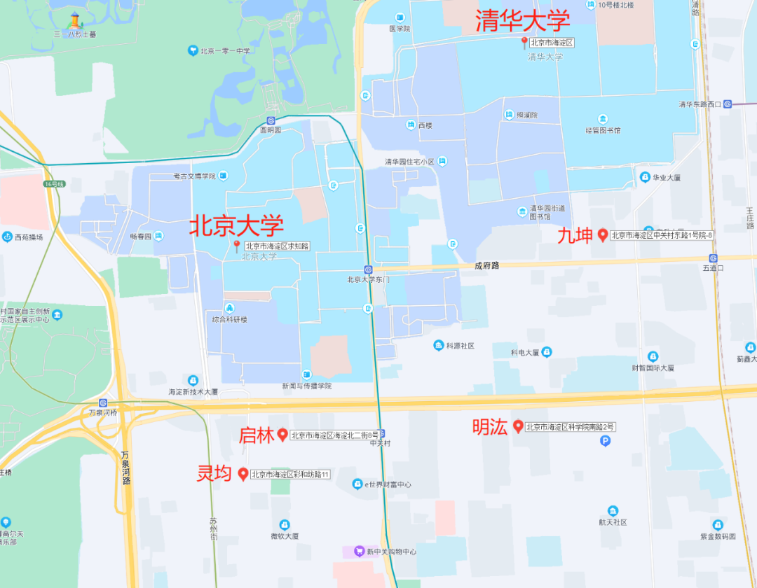 数家百亿量化在清华、北大等名校附近均设有办公室,以便就近吸纳优秀人才。据情报局统计,明汯、灵均、九坤和启林在北京的办公地距离清北仅步行1公里左右的距离,九坤所在的办公地清华科技园甚至距离清华大学东南门仅约300米。