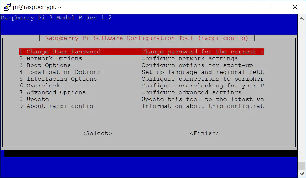 命令行界面输入命令,进入树莓派配置界面。用上下键和左右键切换光标位置。