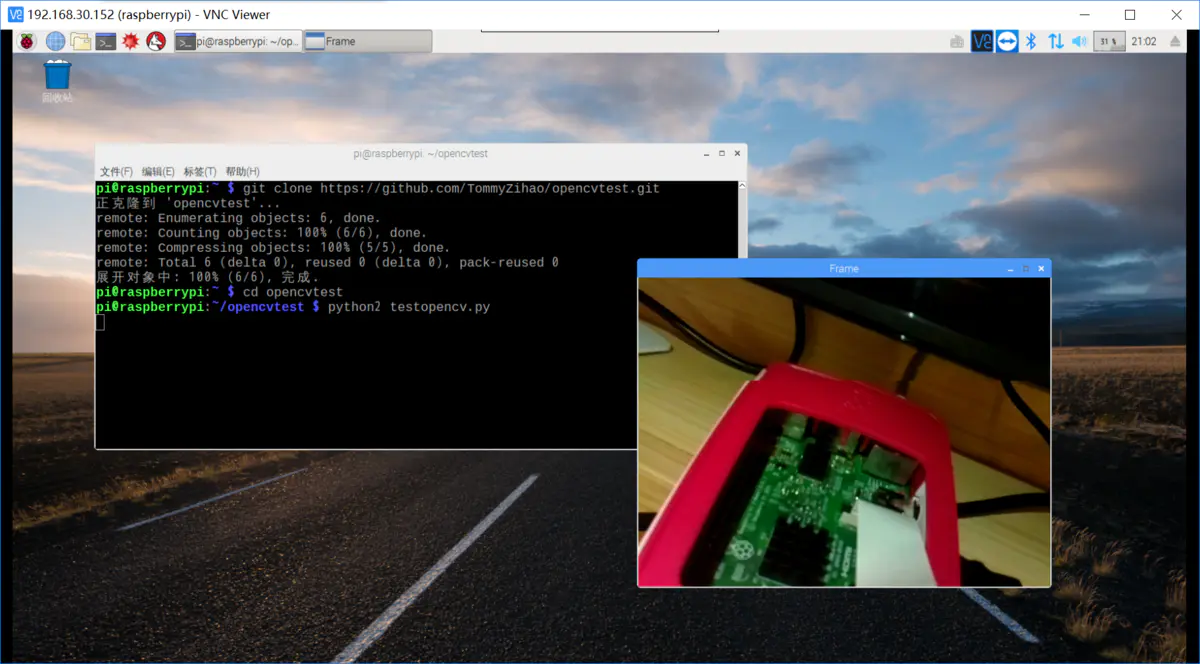 调用摄像头拍一张照片,命名为image.jpg,存储在/pi/home路径,也就是桌面左上角资源管理器一打开显示的那个路径。如果能看到摄像头上红灯亮,目录里面有照片,则进一步说明摄像头配置正确。