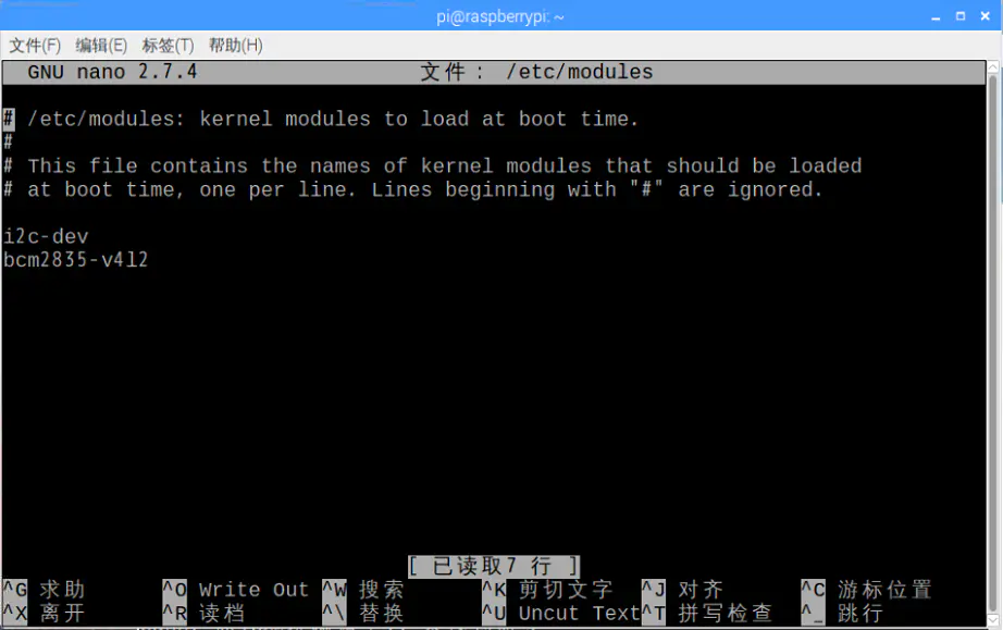 在命令行输入以下命令,这个命令的意思是用nano编辑器打开modules这个文件: