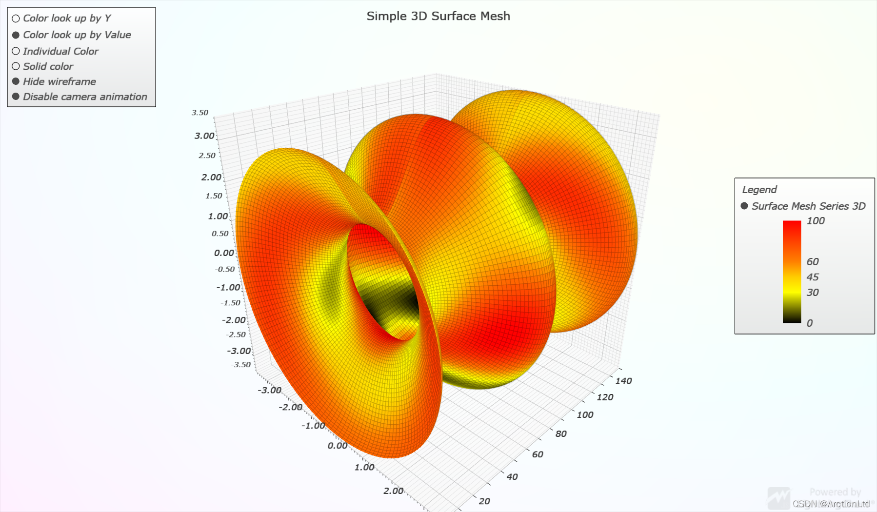图表是用SurfaceMeshSeries3D渲染的,这是一个serie类型,可以渲染一个连续的三维网格,每个单独的数据点都可以配置自己的颜色(也可以从一个附加的颜色表中动态查询)。