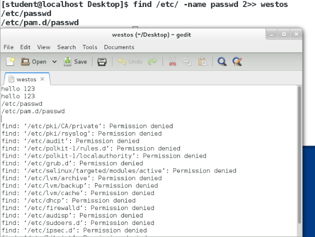 find /etc/ -name passwd >> westos #将passwd的正确输出内容追加( >> )到westos中