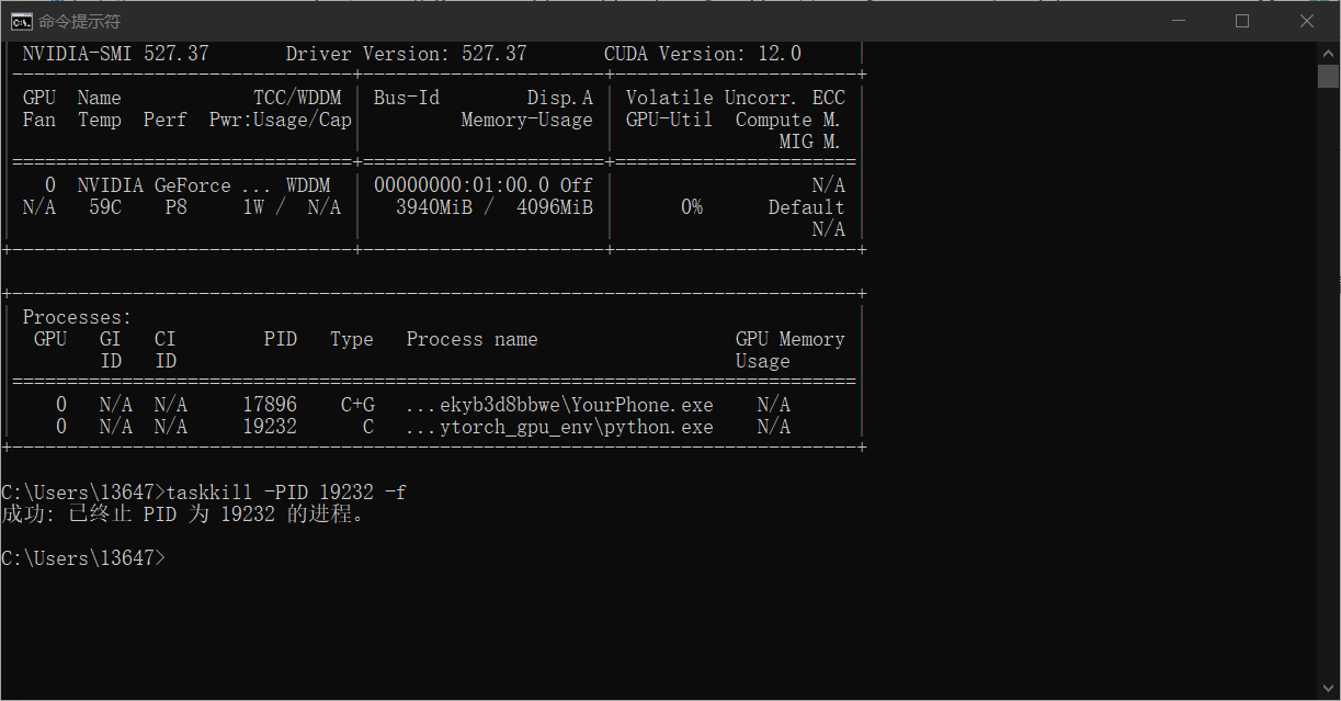 输入nvidia-smi查看gpu型号和使用进程PID(我的为17896和19232)
