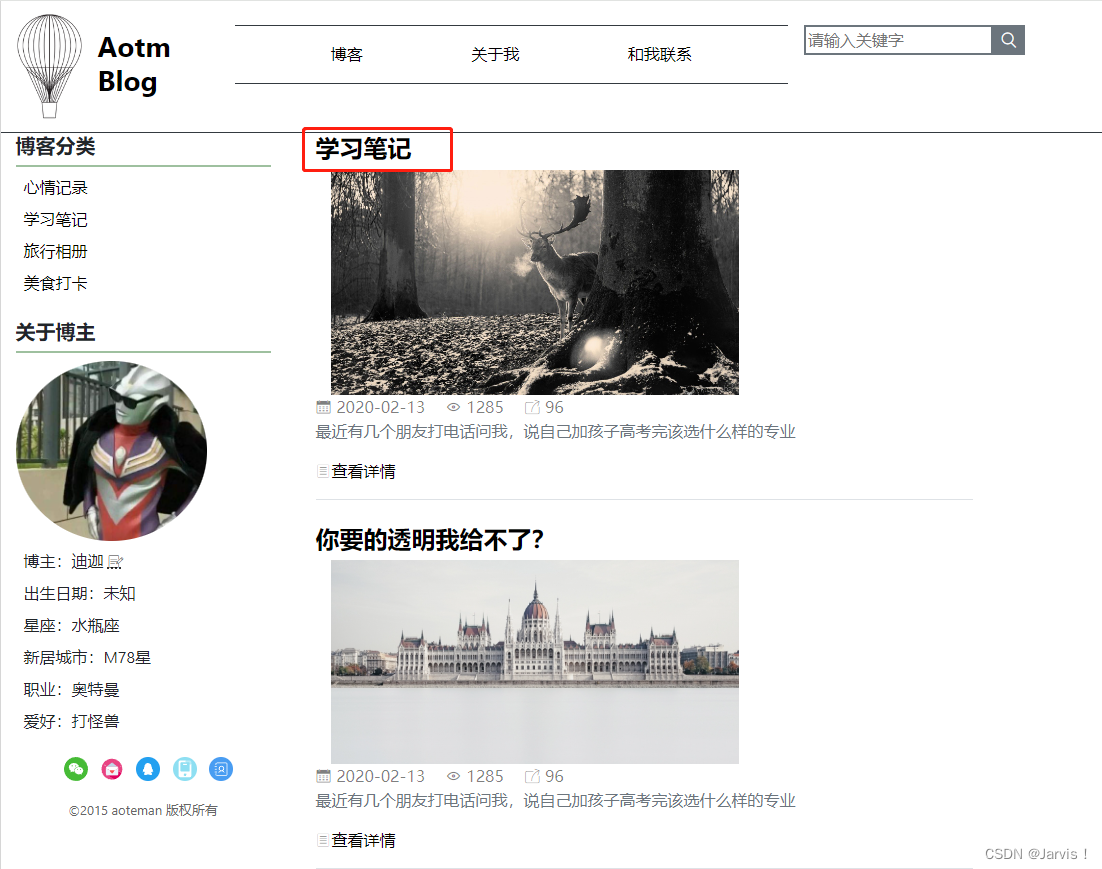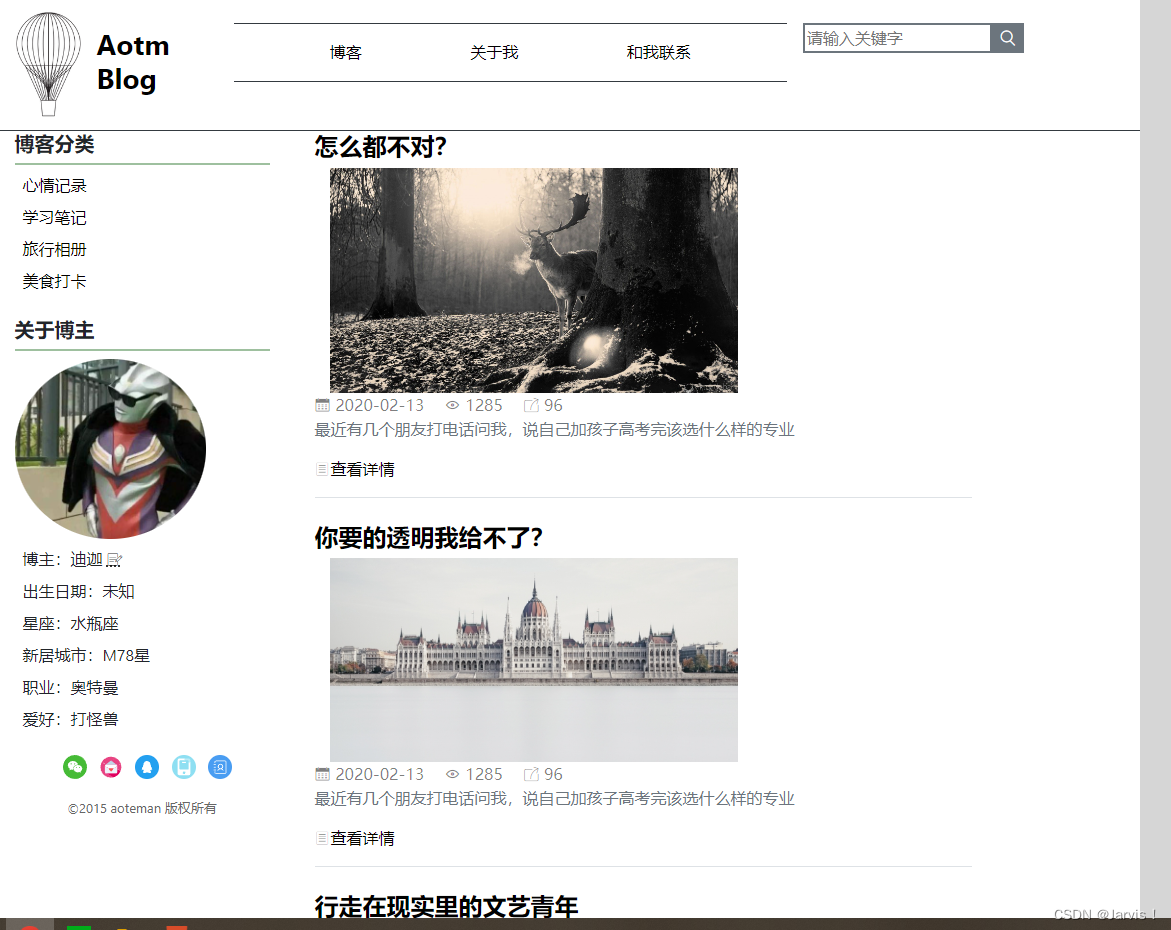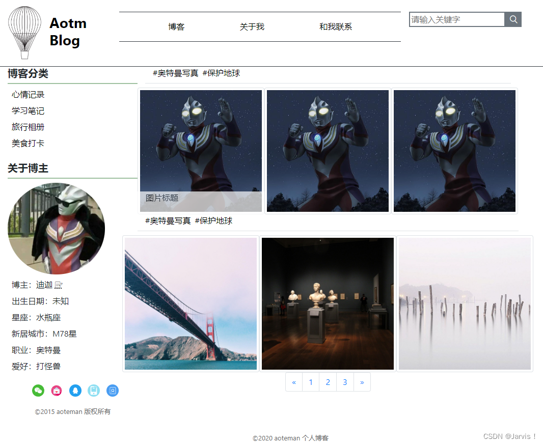 使用bootstrap框架做一个Aotm Blog个人博客,展示一些自己的个人信息,有四个博客分类:心情记录、学习笔记、旅行相册、美食打卡。