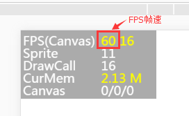 方框内显示的是帧数,下面的Sprite,DrawCall,CurMem都是游戏开发比较常用的词语,可以自行查询和学习,这里就不再更多解释了。