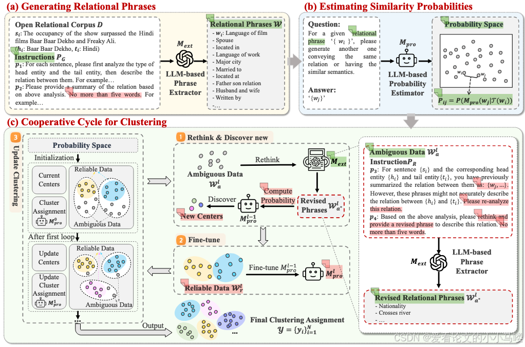 LLM 的潜力: LLM 具备强大的生成能力,可以直接生成自然语言形式的关系标签,而不仅仅是做分类或聚类。