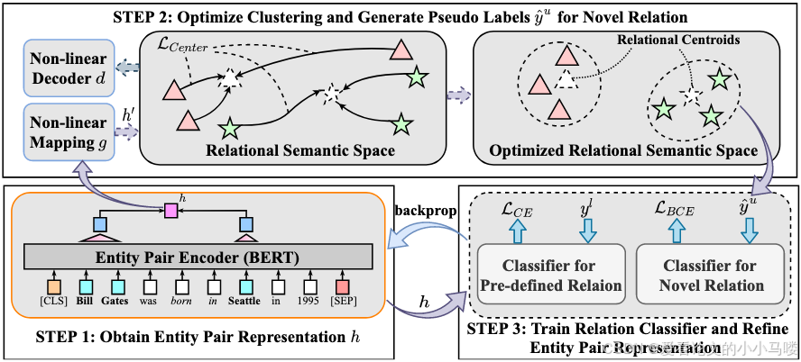 对于无标签数据(新关系):利用上一步生成的伪标签,通过成对损失函数 (Pairwise Loss) 进行训练。如果两个样本聚到了同一类,拉近它们的距离;如果不同类,推远它们的距离。