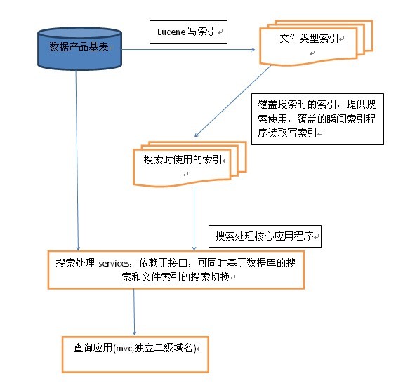 说是电子商务搜索架构方案,其实就是lucene.net的应用,公司庙小,人少,也就自己平时看看,以前做过一点例子,这样就被拉上去写架构方案了。我这个懒惰的家伙,在网上疯狂的搜集搜索架构方面的东西,因为做做架构,暂时没写代码,每天就看人家博客,结果两个星期了才弄了个大概的草图,这不清明节过后就要详细方案了,现在只能把我的草图分享一下,希望大家板砖伺候,闷在家里鼓捣比较郁闷啊,效率太低。